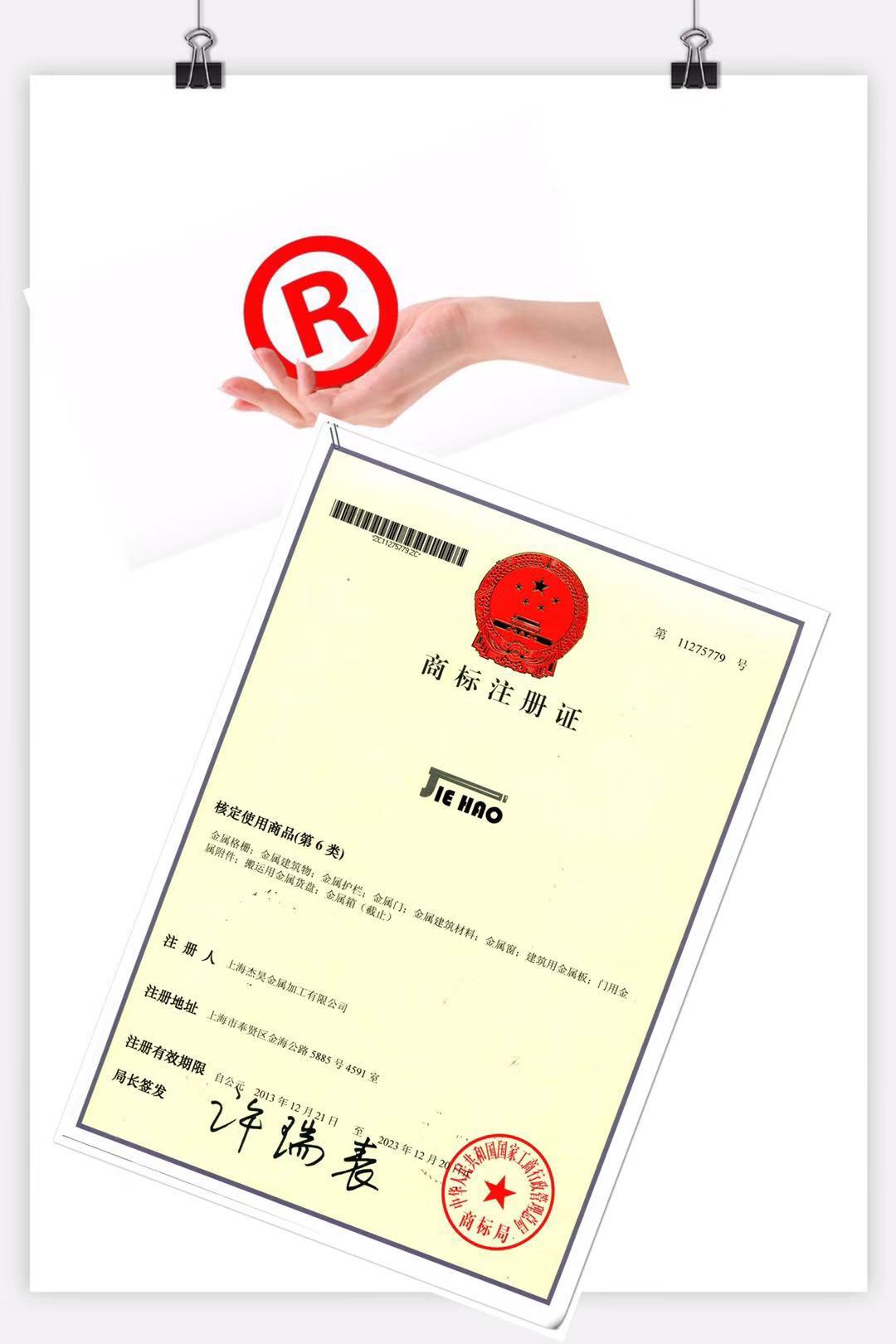 2013年12月21日 商标注册证:JIEHAO杰昊