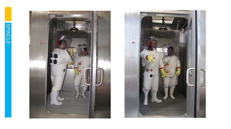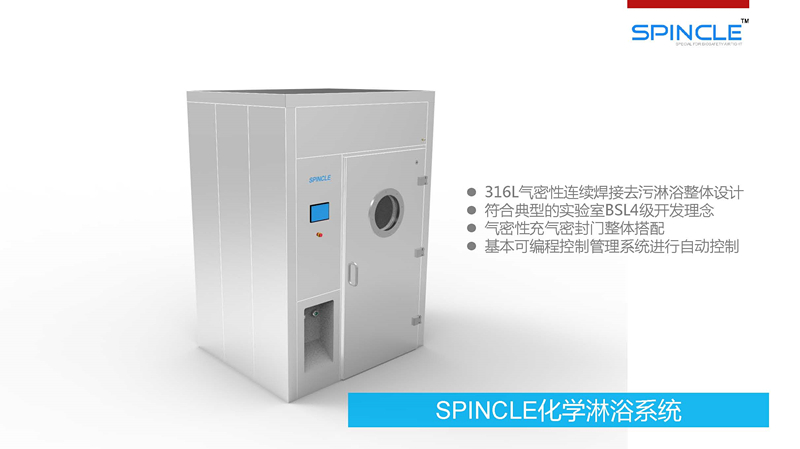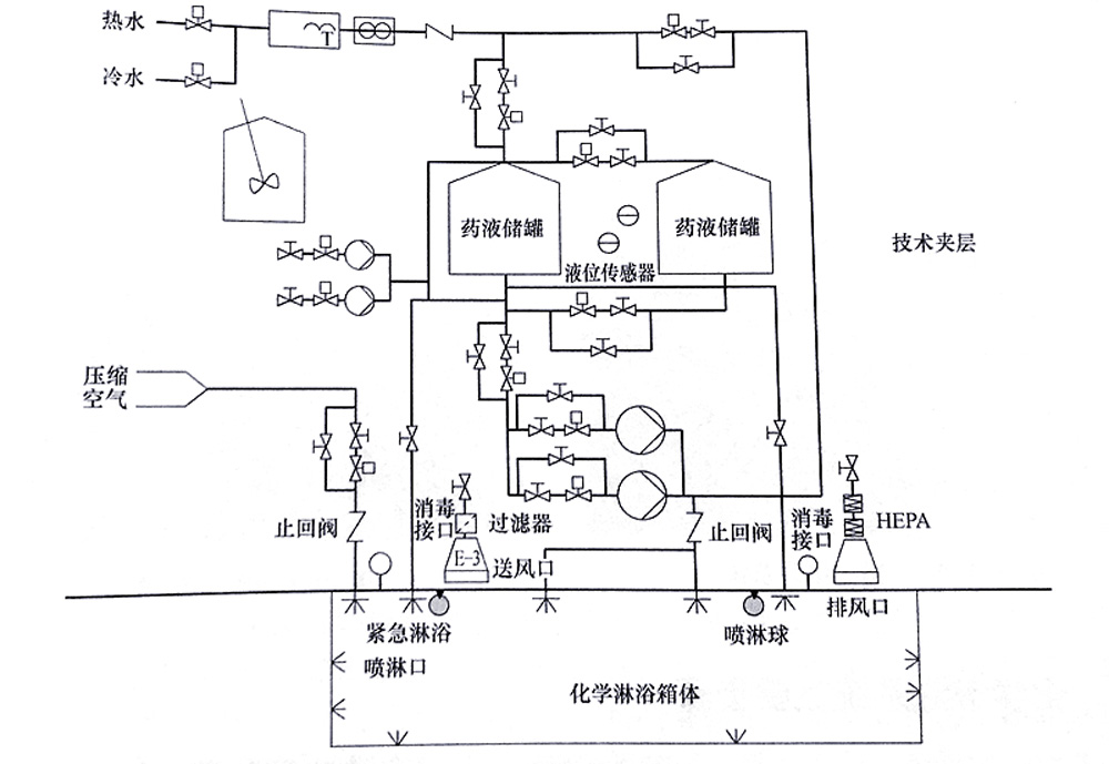 化学淋浴消毒装置是高级别生物安全实验室中一个关键的防护设备,适用于身着防护服的人员消毒,在人员离开高污染区时防止可能产生的污染。其结构组成主要包括:水箱、两道互锁式气密门(常规为充气式气密门)、加药系统、喷淋系统、控制系统、送/排风系统、排水系统及供气系统(提供给正压防护服)。化学淋浴消毒装置为独立一套装置,其给水排水防回流措施、液位报警装置、箱体气密性、送/排风高效过滤器性能等由设备供货商确保质量符合标准要求